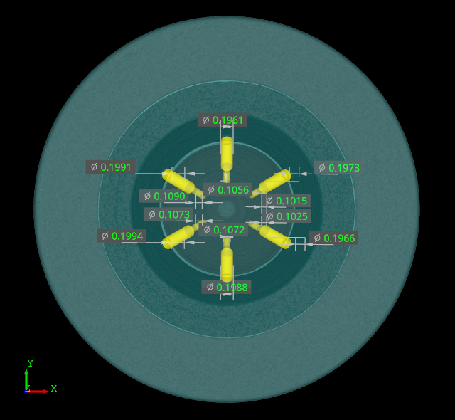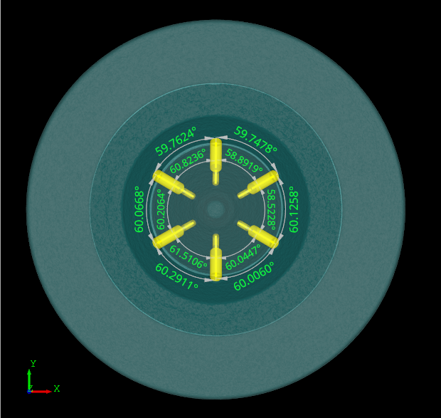 この手法の利点は、測定対象物のすべての部分がX線光源から検出器まで、少なくとも1回は水平方向に透過されることです。原理上、コーンビームおよびリングアーチファクトは発生しません。また、様々な方向から測定対象物のX線透過画像が得られることで三次元形状の再現精度が上がり、結果としてアーチファクトの少ない鮮明な像が取得できます。