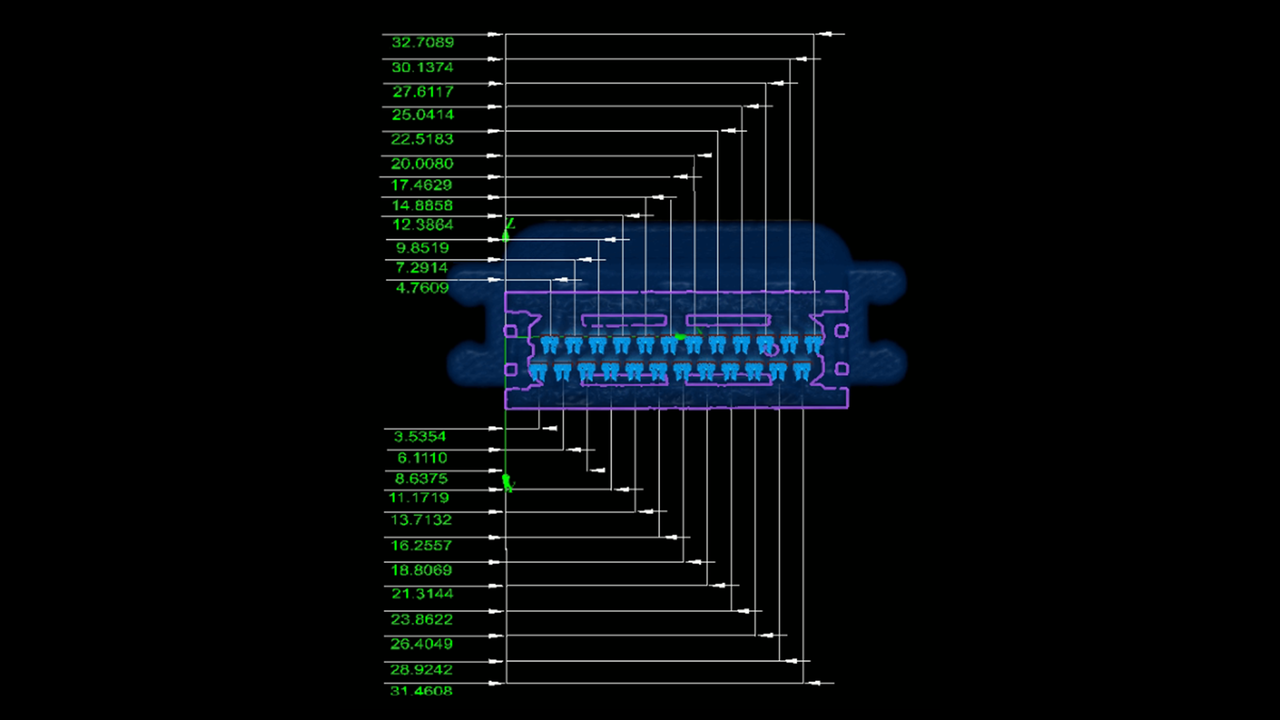 樹脂の側面を基準にした、各金属ピンの距離を測定しています。