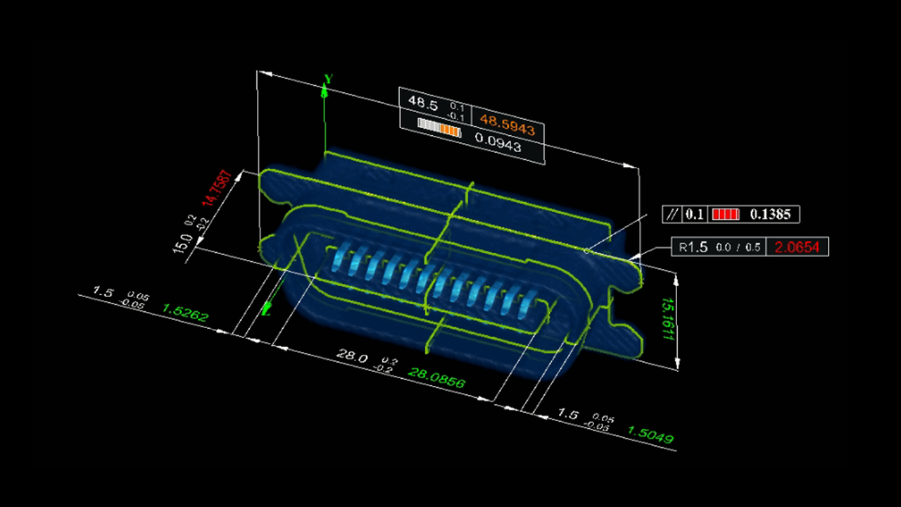 それぞれ寸法測定や幾何公差測定を行い、スペックに対する合否を数値と色で出力します。